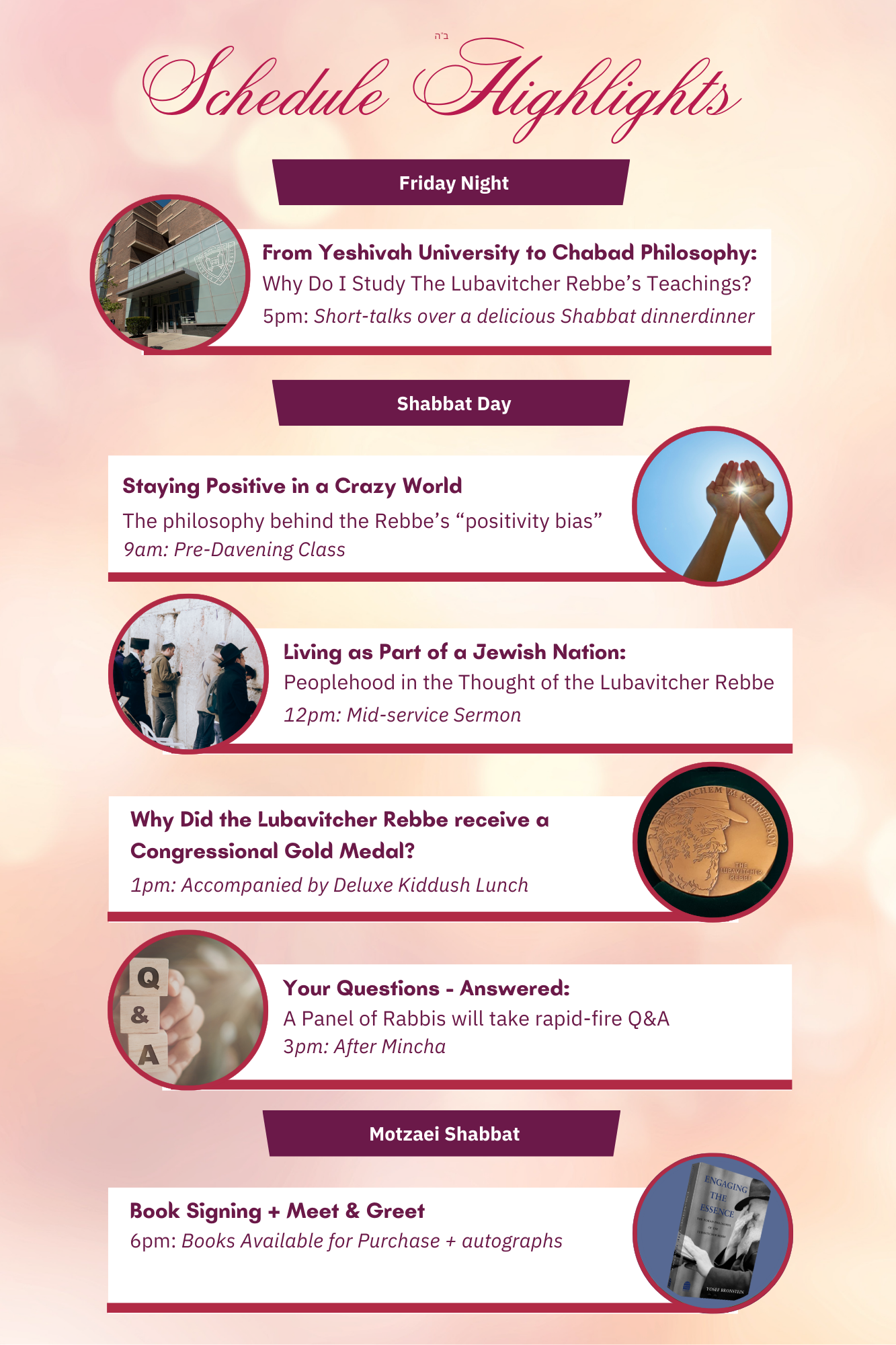 Upcoming Categories: All Events Courses Weekly Classes Clubs Upcoming All Events Courses Weekly Classes Clubs Captivating Cases in Rabbinic Responsa The Rebbe's Lens Oneg Shabbat with Dr. Yosef Bronstein This World is a Garden The Art of Marriage Oneg Shabbat with Dr. Yehuda Pryce The Mechanics of Faith A Taste of Thanks Jews in Space For All Mankind A Night at Sinai Sinai & Civics An Evening with the Rebbe Heaven on Earth Kosher Pickle Factory Communication: Its Art & Soul PJA Bundles The Wrap Club Mentsch Club Women's Circle The Holy Hiking Club Club 54 Mentsch at Work Talmud Torah & Tea Wine & Wisdom Practical Tanya Whispers of the Soul The Chasidic Parsha To Build a Home Donate